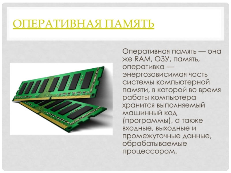 Оперативная памятьОперативная память — она же RAM, ОЗУ, память, оперативка — энергозависимая часть системы компьютерной памяти, в