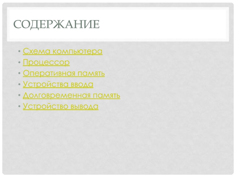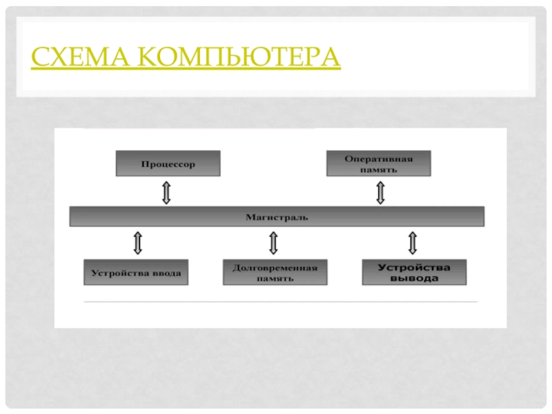 СодержаниеСхема компьютераПроцессорОперативная памятьУстройства вводаДолговременная памятьУстройство вывода
