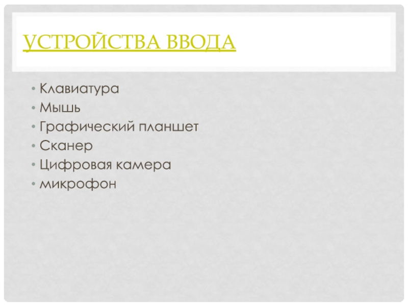Устройства вводаКлавиатураМышьГрафический планшетСканерЦифровая камерамикрофон