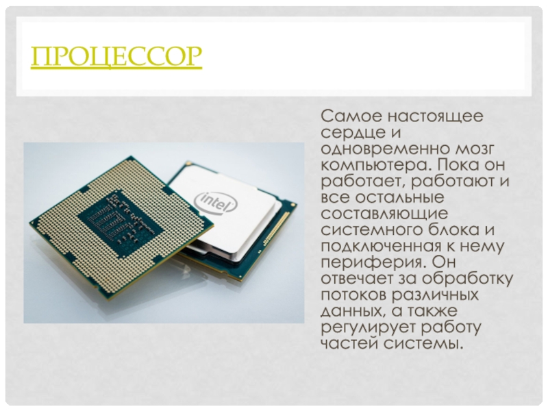 ПроцессорСамое настоящее сердце и одновременно мозг компьютера. Пока он работает, работают и все остальные составляющие системного блока