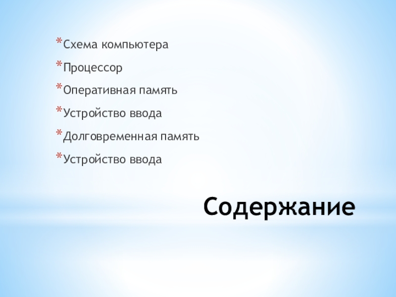СодержаниеСхема компьютераПроцессорОперативная памятьУстройство вводаДолговременная памятьУстройство ввода