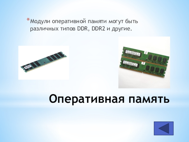 Оперативная памятьМодули оперативной памяти могут быть различных типов DDR, DDR2 и другие.