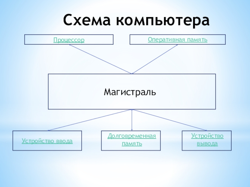 Схема компьютераМагистраль Процессор Оперативная памятьУстройство вводаДолговременная памятьУстройство вывода