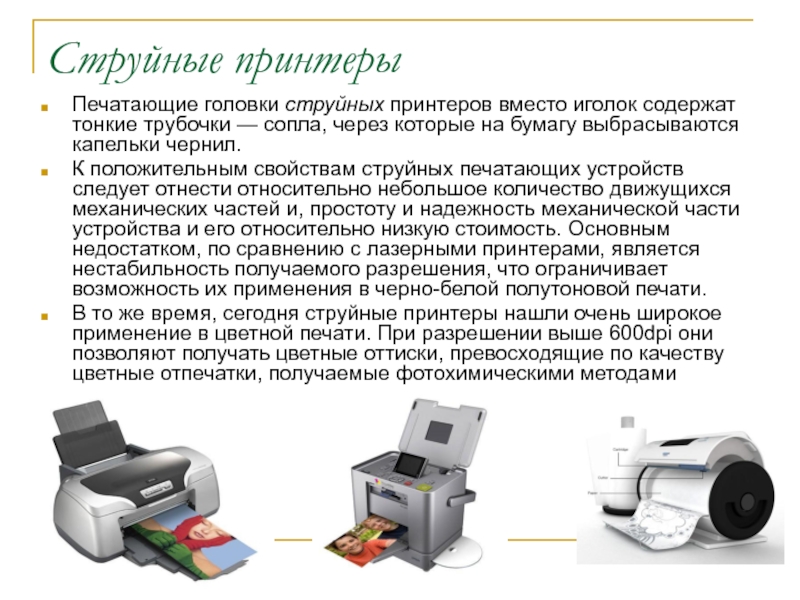 В то же время, сегодня струйные принтеры нашли очень широкое применение в цветной печати. При разрешении выше 600dpi они позволяют получать цветные оттиски, превосходящие по качеству цветные отпечатки, получаемые фотохимическими методами