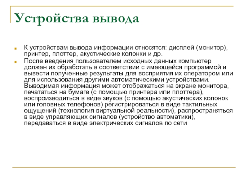должен их обработать в соответствии с имеющейся программой и вывести полученные результаты для восприятия их оператором или для использования другими автоматическими устройствами. Выводимая информация может отображаться на экране монитора, печататься на бумаге (с помощью принтера или плоттера), воспроизводиться в виде звуков (с помощью акустических колонок или головных телефонов) регистрироваться в виде тактильных ощущений (технология виртуальной реальности), распространяться в виде управляющих сигналов (устройство автоматики), передаваться в виде электрических сигналов по сети