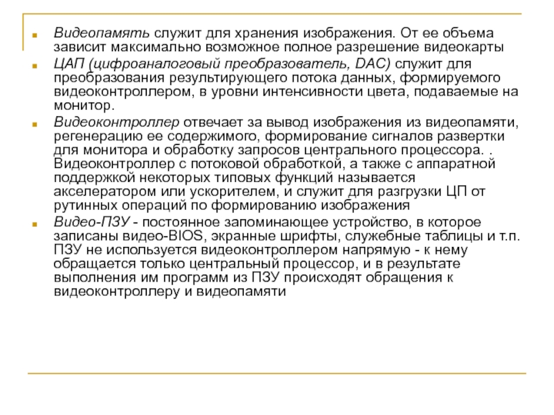 Слайд 16Видеопамять служит для хранения изображения. От ее объема зависит максимально