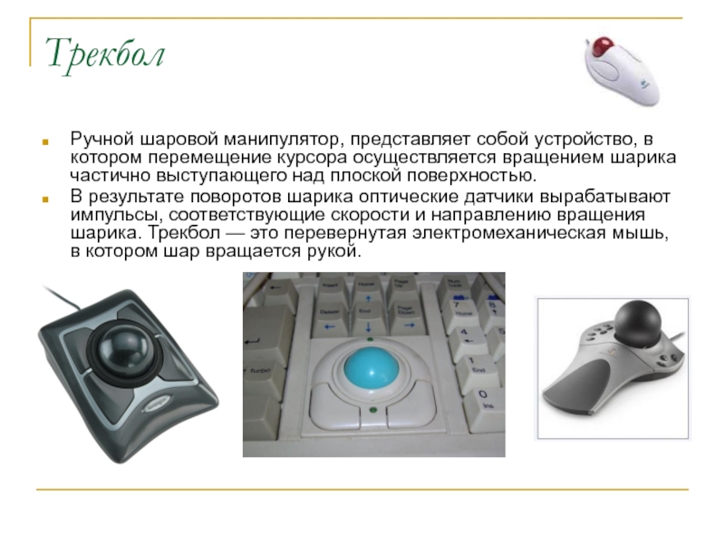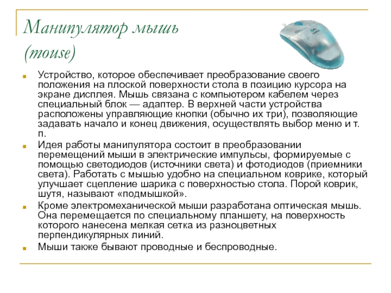 перемещения по планшету специального указателя. Работа с графическим планшетом аналогична рисованию карандашом. Особенно они удобны для формирования штриховых рисунков и чертежей. У графического планшета высокая разрешающая способность. Эти устройства предназначены для ввода художественной графической информации.