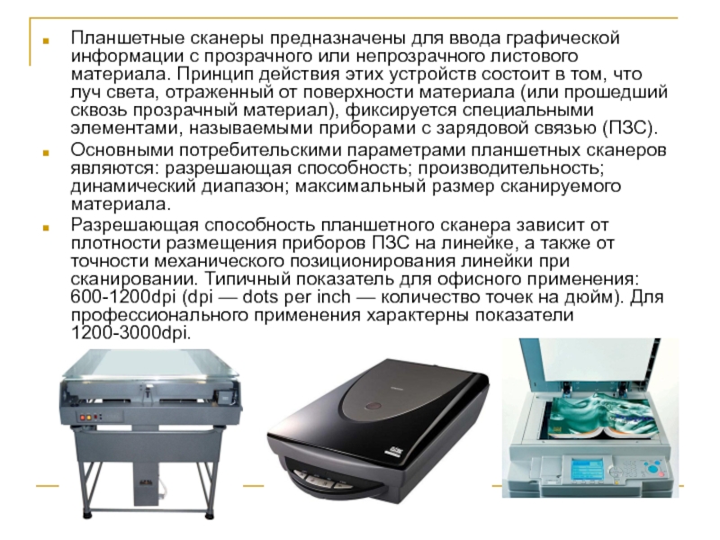 Основными потребительскими параметрами планшетных сканеров являются: разрешающая способность; производительность; динамический диапазон; максимальный размер сканируемого материала.