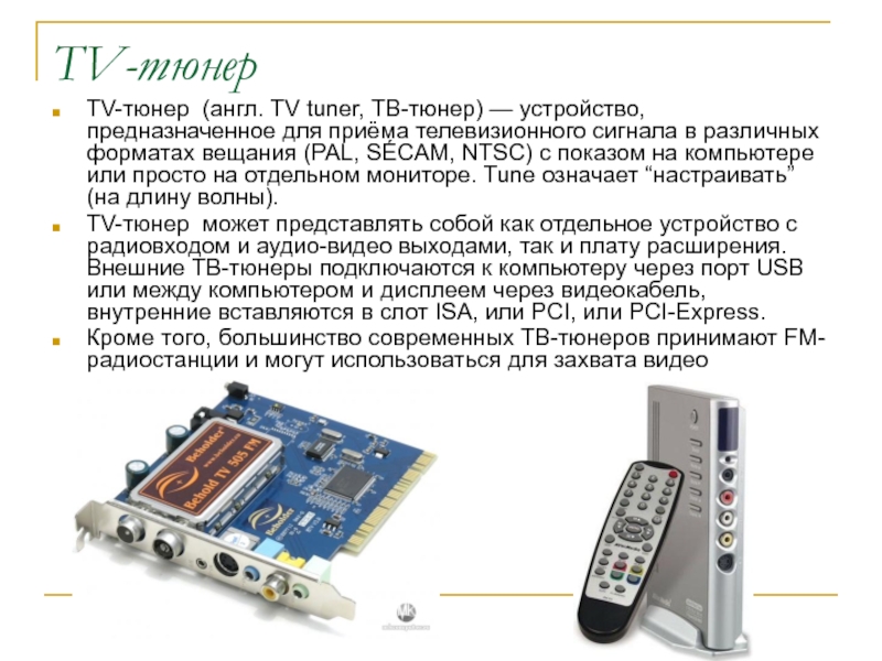 TV-тюнер может представлять собой как отдельное устройство с радиовходом и аудио-видео выходами, так и плату расширения. Внешние ТВ-тюнеры подключаются к компьютеру через порт USB или между компьютером и дисплеем через видеокабель, внутренние вставляются в слот ISA, или PCI, или PCI-Express.