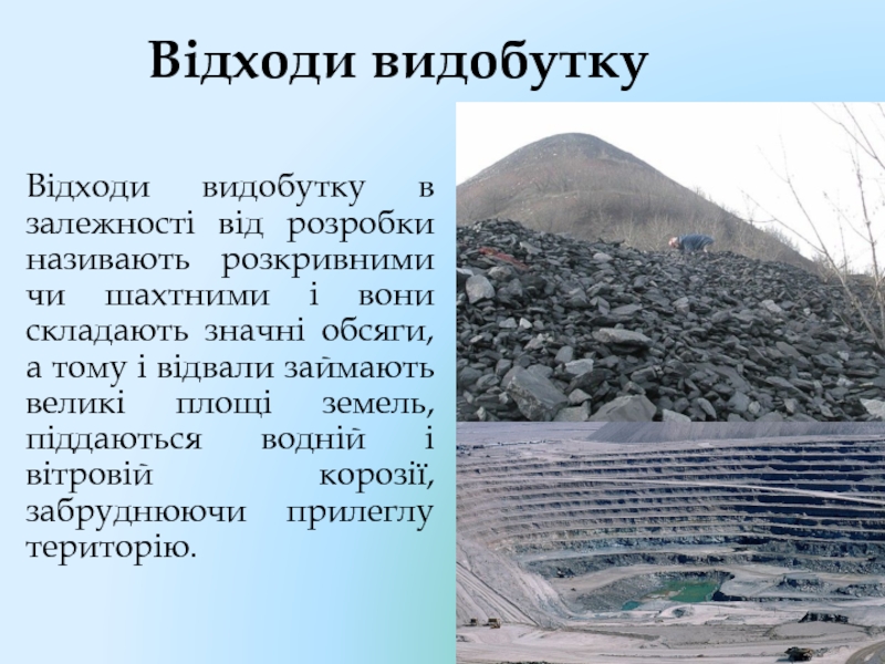 Відходи видобуткуВідходи видобутку в залежності від розробки називають розкривними чи шахтними і вони складають значні обсяги, а