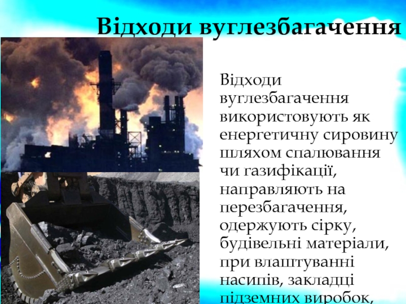 Відходи вуглезбагаченняВідходи вуглезбагачення використовують як енергетичну сировину шляхом спалювання чи газифікації, направляють на перезбагачення, одержують сірку, будівельні
