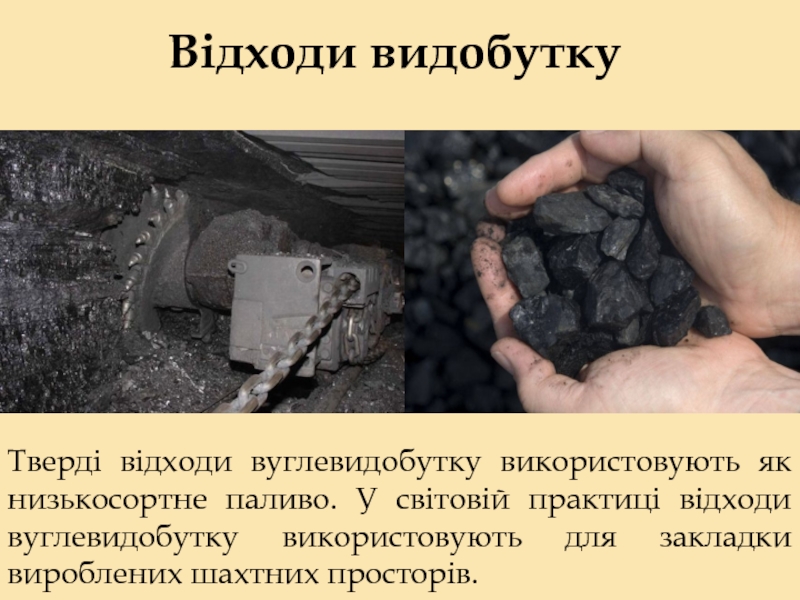 Відходи видобуткуТверді відходи вуглевидобутку використовують як низькосортне паливо. У світовій практиці відходи вуглевидобутку використовують для закладки вироблених