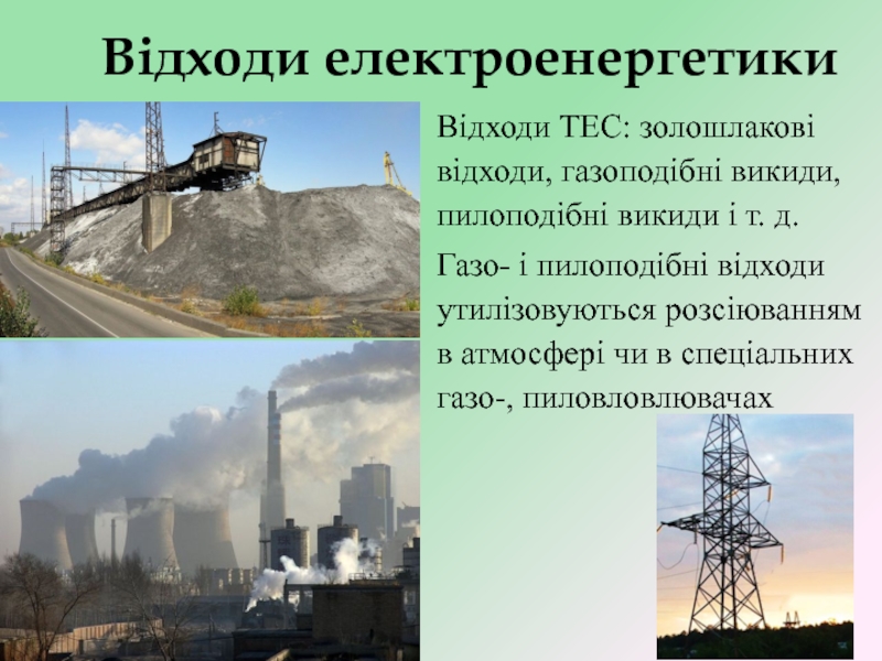 Відходи електроенергетикиВідходи ТЕС: золошлакові відходи, газоподібні викиди, пилоподібні викиди і т. д. Газо- і пилоподібні відходи утилізовуються