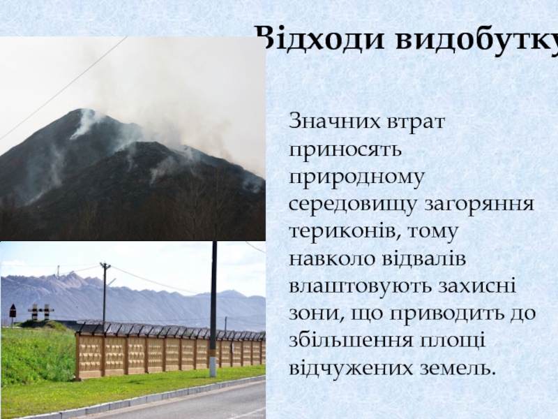 Відходи видобуткуЗначних втрат приносять природному середовищу загоряння териконів, тому навколо відвалів влаштовують захисні зони, що приводить до