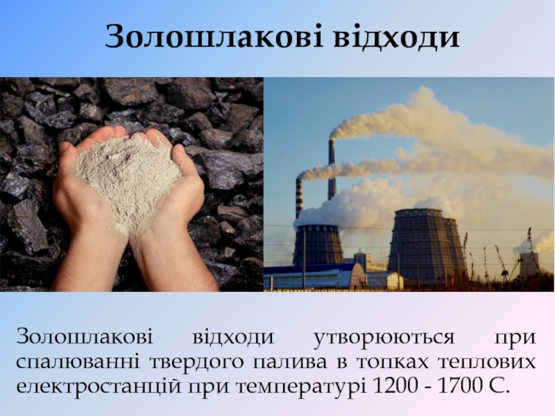 Золошлакові відходиЗолошлакові відходи утворюються при спалюванні твердого палива в топках теплових електростанцій при температурі 1200 - 1700