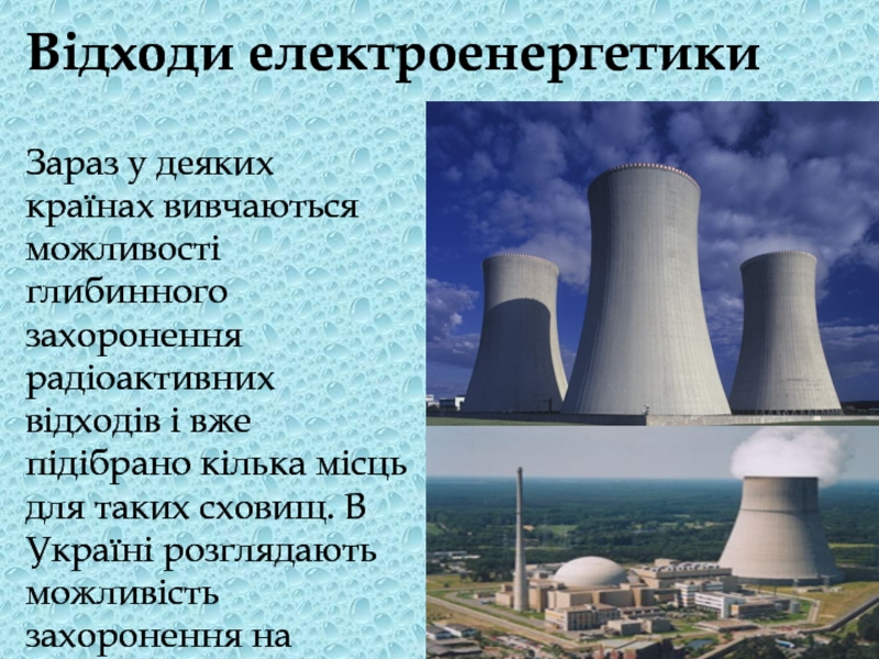 Відходи електроенергетикиЗараз у деяких країнах вивчаються можливості глибинного захоронення радіоактивних відходів і вже підібрано кілька місць для