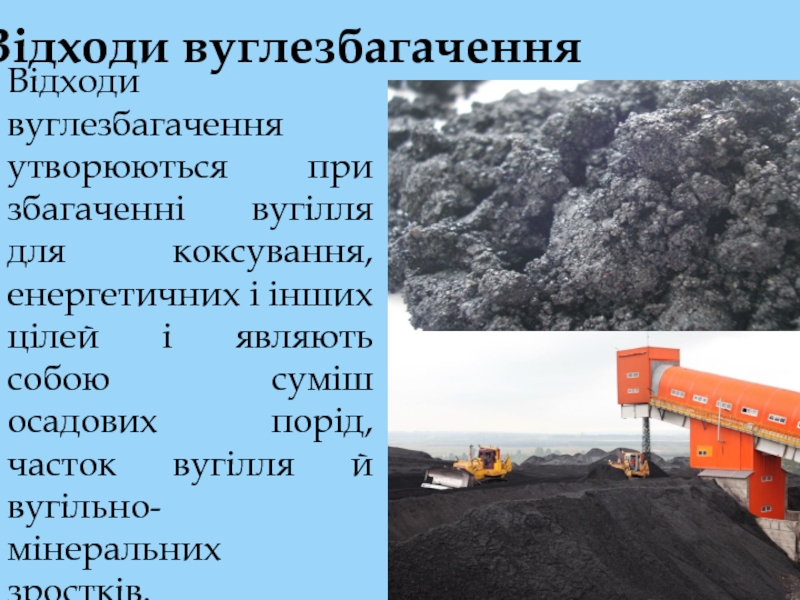 Відходи вуглезбагаченняВідходи вуглезбагачення утворюються при збагаченні вугілля для коксування, енергетичних і інших цілей і являють собою суміш