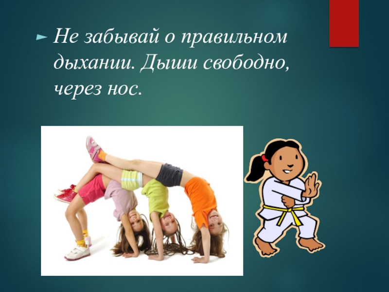 Слайд 11Не забывай о правильном дыхании. Дыши свободно, через нос.