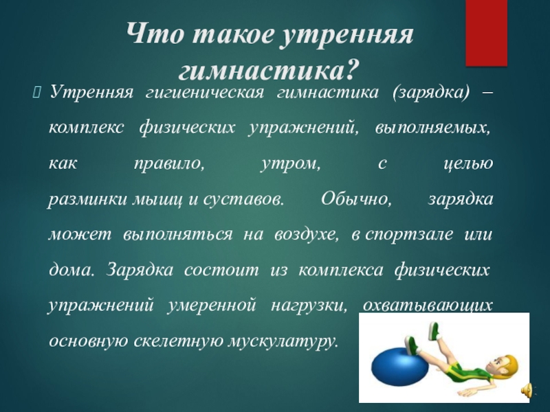 Что такое утренняя гимнастика?Утренняя гигиеническая гимнастика (зарядка) –комплекс физических упражнений, выполняемых, как правило, утром, с целью разминки мышц и суставов. Обычно, зарядка может выполняться на воздухе,