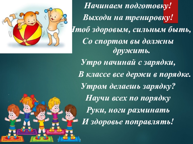 Начинаем подготовку!Выходи на тренировку!Чтоб здоровым, сильным быть,Со спортом вы должны дружить.Утро начинай с зарядки,В классе все держи