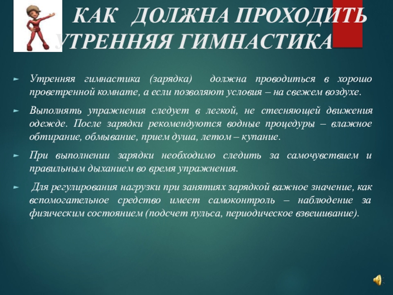 КАК  ДОЛЖНА ПРОХОДИТЬ УТРЕННЯЯ ГИМНАСТИКА     Утренняя гимнастика