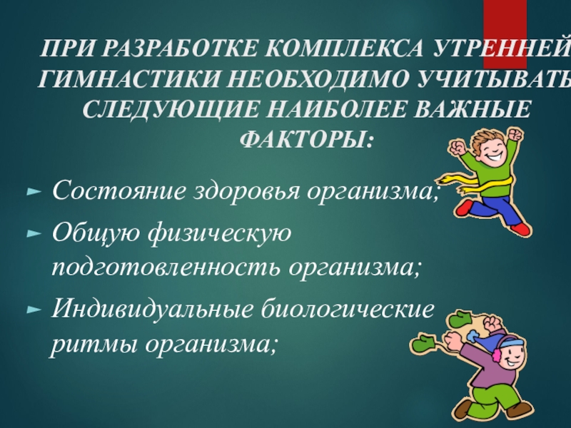 ПРИ РАЗРАБОТКЕ КОМПЛЕКСА УТРЕННЕЙ ГИМНАСТИКИ НЕОБХОДИМО УЧИТЫВАТЬ СЛЕДУЮЩИЕ НАИБОЛЕЕ ВАЖНЫЕ ФАКТОРЫ:Состояние здоровья организма;Общую физическую подготовленность организма;Индивидуальные биологические