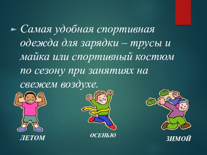 Слайд 9Самая удобная спортивная одежда для зарядки – трусы и майка