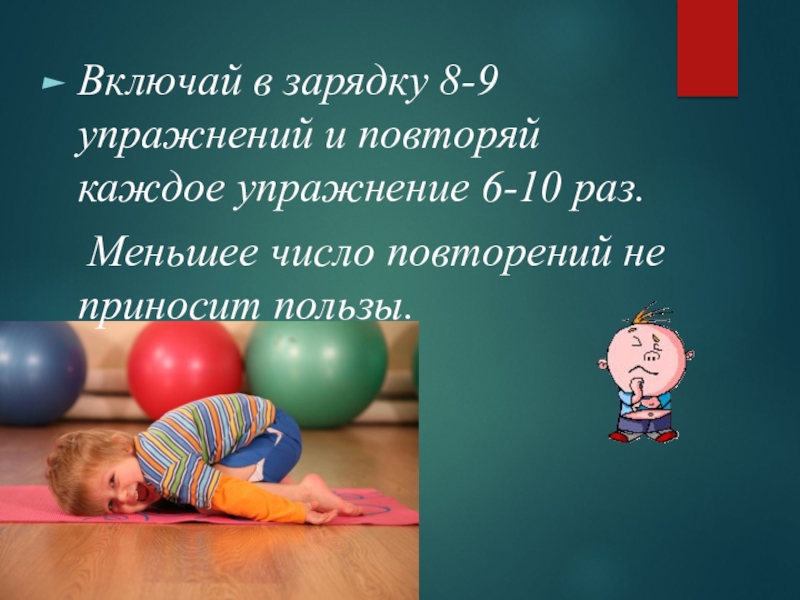 Слайд 10Включай в зарядку 8-9 упражнений и повторяй каждое упражнение 6-10