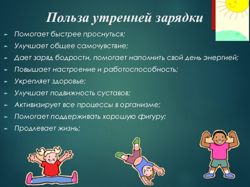 Польза утренней зарядкиПомогает быстрее проснуться;Улучшает общее самочувствие;Дает заряд бодрости, помогает наполнить свой день энергией;Повышает настроение и работоспособность;Укрепляет