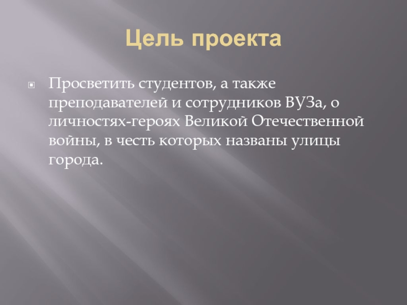 Цель проектаПросветить студентов, а также преподавателей и сотрудников ВУЗа, о личностях-героях Великой Отечественной войны, в честь которых названы улицы города.