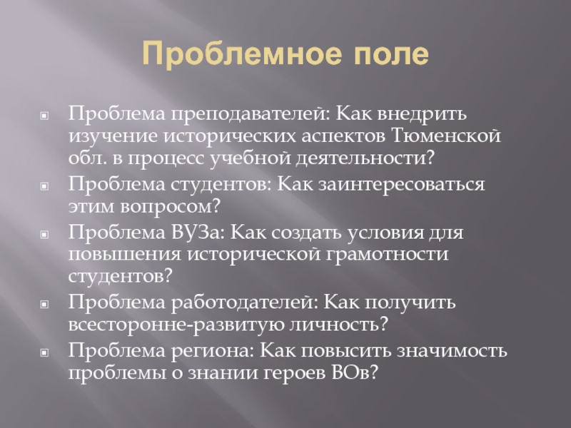 Проблемное полеПроблема преподавателей: Как внедрить изучение исторических аспектов Тюменской обл. в процесс учебной деятельности?Проблема студентов: Как заинтересоваться