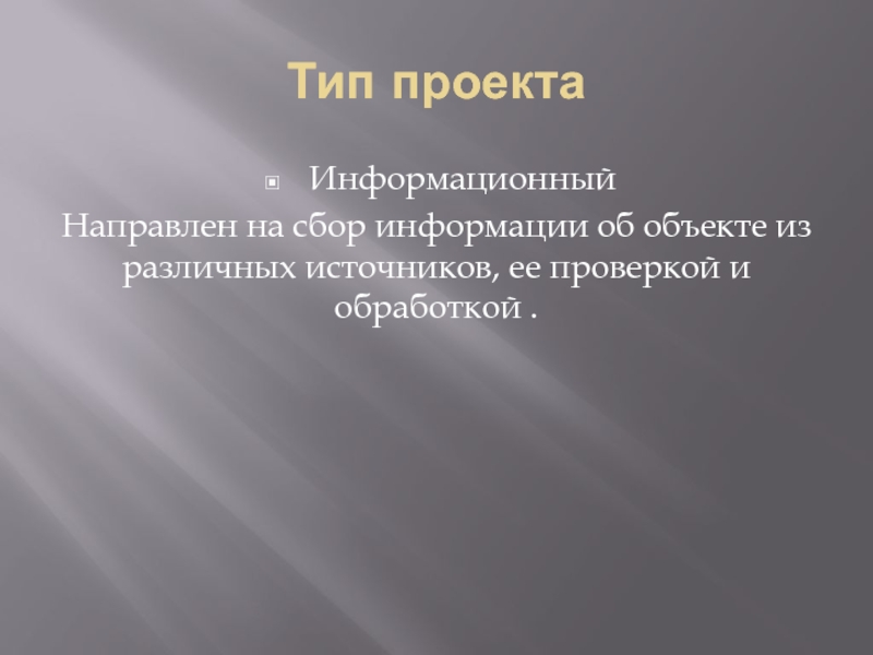 Тип проектаИнформационный Направлен на сбор информации об объекте из различных источников, ее проверкой и обработкой .