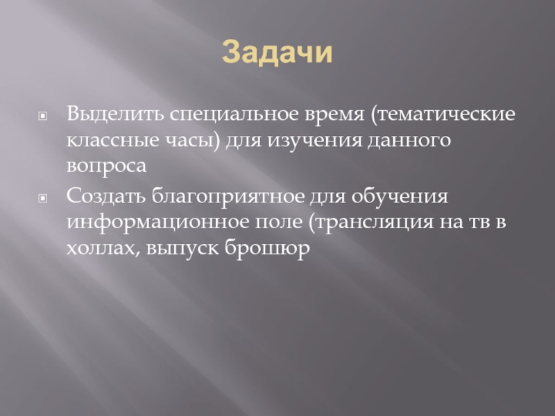 ЗадачиВыделить специальное время (тематические классные часы) для изучения данного вопросаСоздать благоприятное для обучения информационное поле (трансляция на
