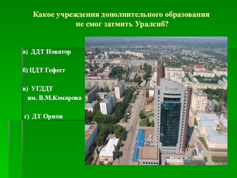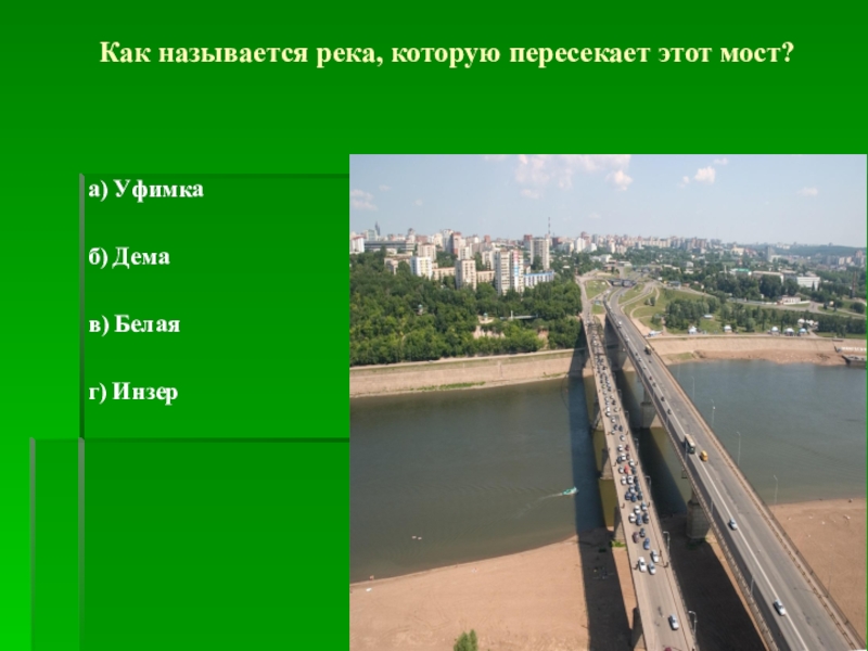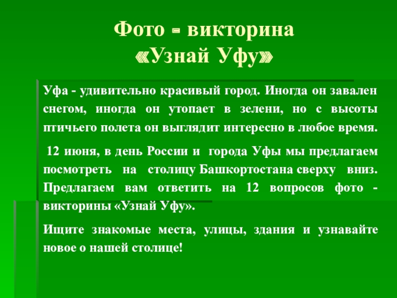 птичьего полета он выглядит интересно в любое время.12 июня, в день России и города Уфы мы предлагаем посмотреть на столицу Башкортостана сверху вниз. Предлагаем вам ответить на 12 вопросов фото - викторины «Узнай Уфу».