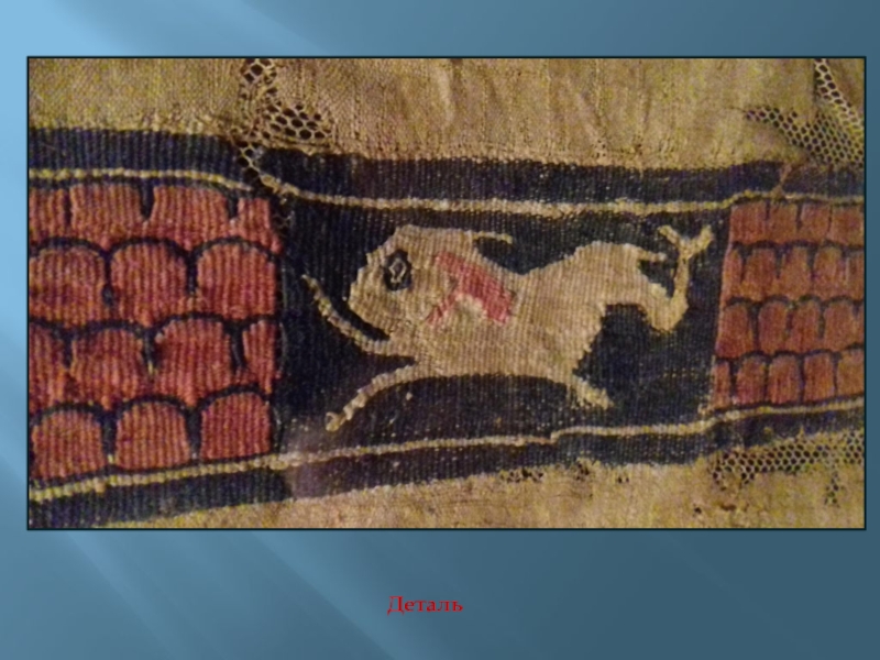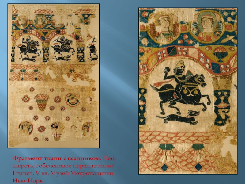 Слайд 15Фрагмент ткани с всадником. Лен, шерсть; гобеленовое переплетение. Египет. V
