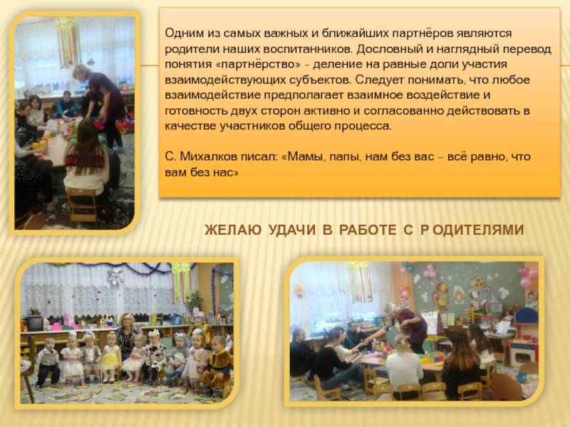Цель мероприятия: рассказать родителям о том, что миссия образовательного учреждения – это организация целенаправленной педагогической деятельности для полноценного развития детей в соответствии с их индивидуальными особенностями,