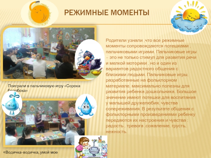 Я предложила родителям «прожить один день», как проживают его дети, познакомить с формами работы, которые способствуют позитивной социализации наших воспитанников
