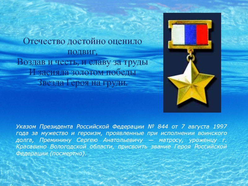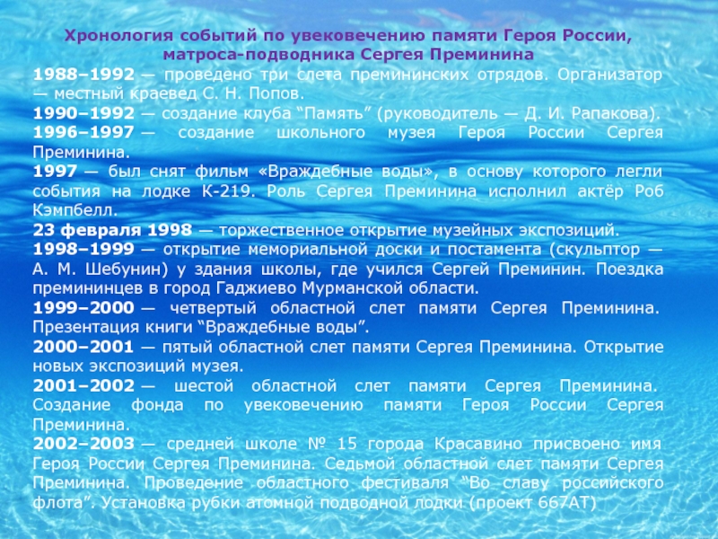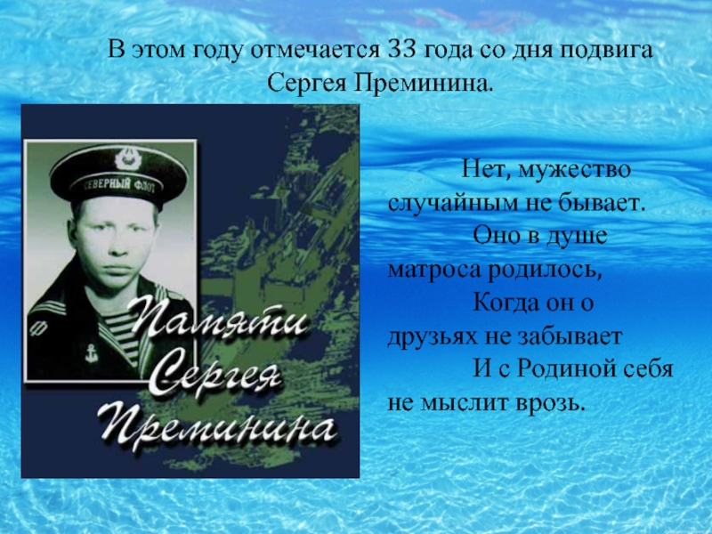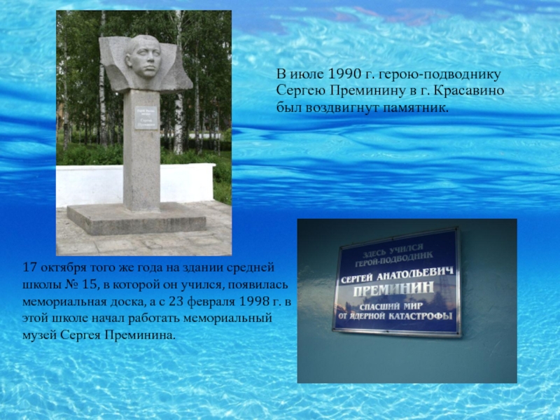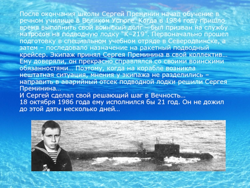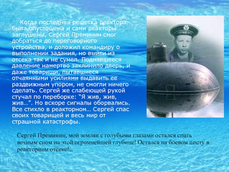 Когда последняя решетка реактора была опустошена и сами реакторы заглушены, Сергей Преминин смог добраться до переговорного устройства, и доложил командиру о выполнении задания, но выйти из отсека так и не сумел. Поднявшееся давление намертво заклинило дверь, и даже товарищи, пытавшиеся отчаянными усилиями выдавить ее раздвижным упором, не смогли ничего сделать. Сергей же слабеющей рукой стучал по переборке: “Я жив, жив, жив…”. Но вскоре сигналы оборвались. Все стихло в реакторном… Сергей спас своих товарищей и весь мир от страшной катастрофы.