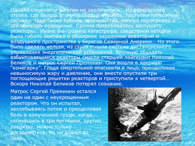 Матрос Сергей Преминин остался один на один с неукрощенным реактором. Что он испытал, захлебываясь потом и преодолевая боль в измученной груди, когда, согнувшись в три погибели, крутил рукоятку, можно только догадываться. Но он дошел до цели…