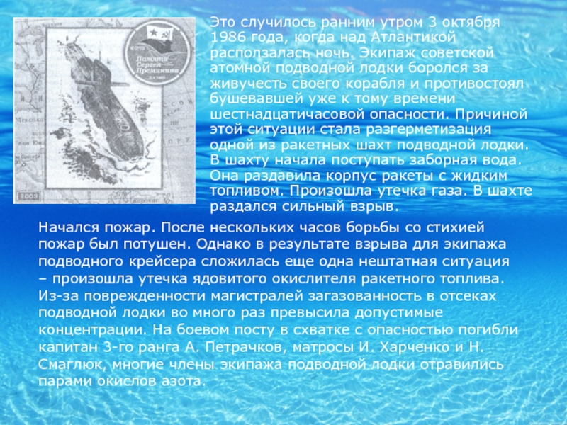 Начался пожар. После нескольких часов борьбы со стихией пожар был потушен. Однако в результате взрыва для экипажа подводного крейсера сложилась еще одна нештатная ситуация – произошла утечка ядовитого окислителя ракетного топлива. Из-за поврежденности магистралей загазованность в отсеках подводной лодки во много раз превысила допустимые концентрации. На боевом посту в схватке с опасностью погибли капитан 3-го ранга А. Петрачков, матросы И. Харченко и Н. Смаглюк, многие члены экипажа подводной лодки отравились парами окислов азота.