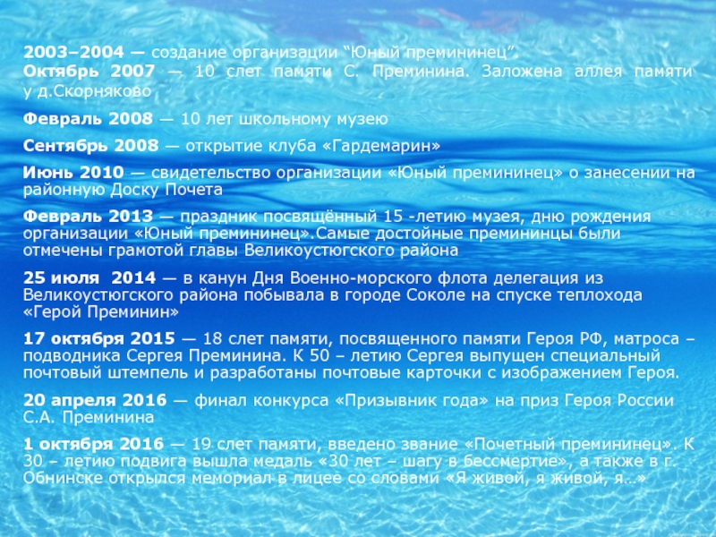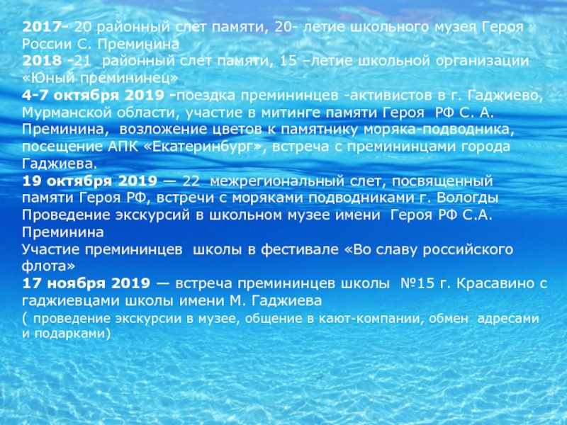 «Юные премининцы» проводят экскурсии в музее, участвуют в конкурсах художественного творчества и пропагандируют подвиг Сергея Преминина.