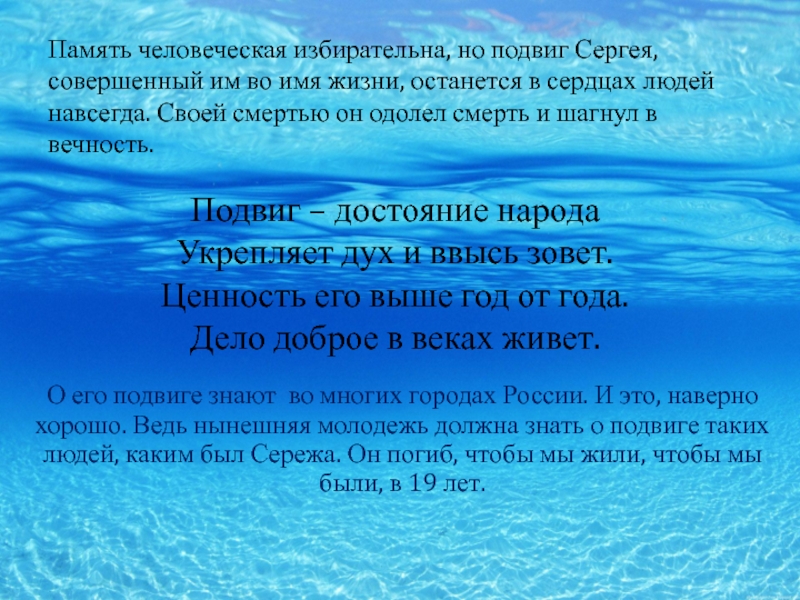Память человеческая избирательна, но подвиг Сергея, совершенный им во имя жизни, останется в сердцах людей навсегда. Своей смертью он одолел смерть и шагнул в вечность.