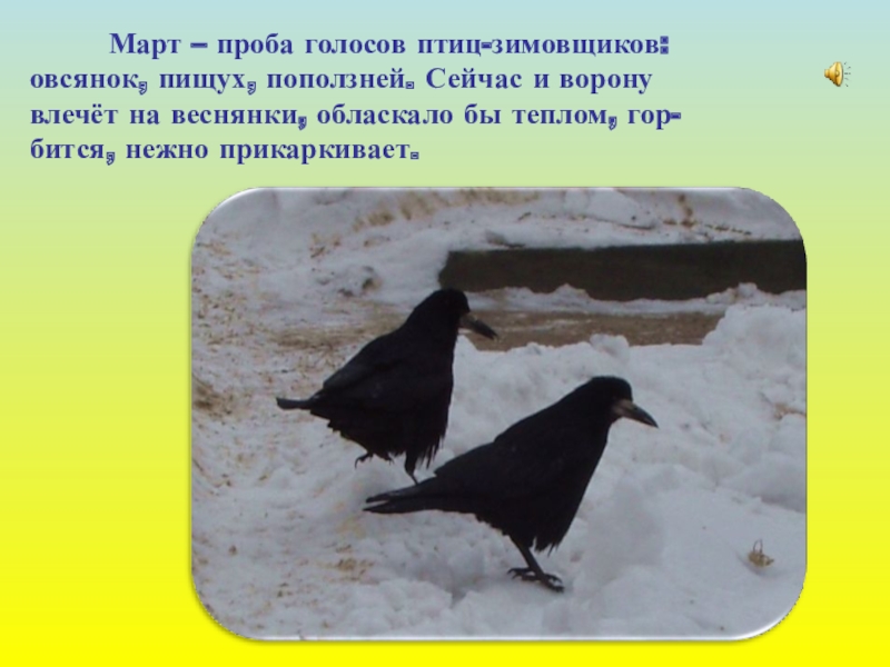 Слайд 10 Март – проба голосов птиц-зимовщиков: