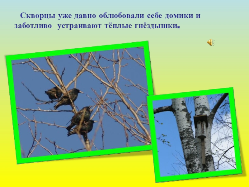 Слайд 41 Скворцы уже давно облюбовали себе домики и заботливо устраивают