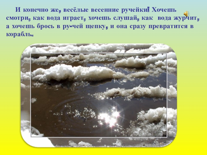 Слайд 20 И конечно же, весёлые весенние ручейки! Хочешь смотри,