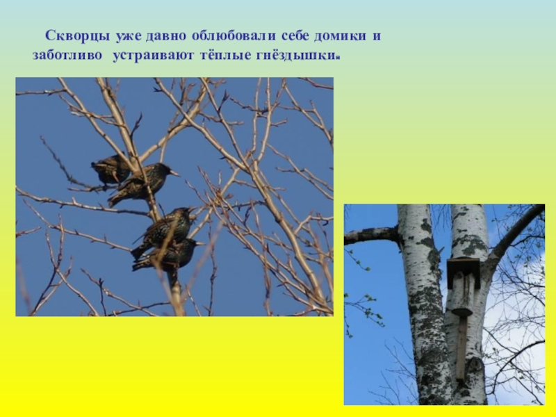 Слайд 37 Скворцы уже давно облюбовали себе домики и