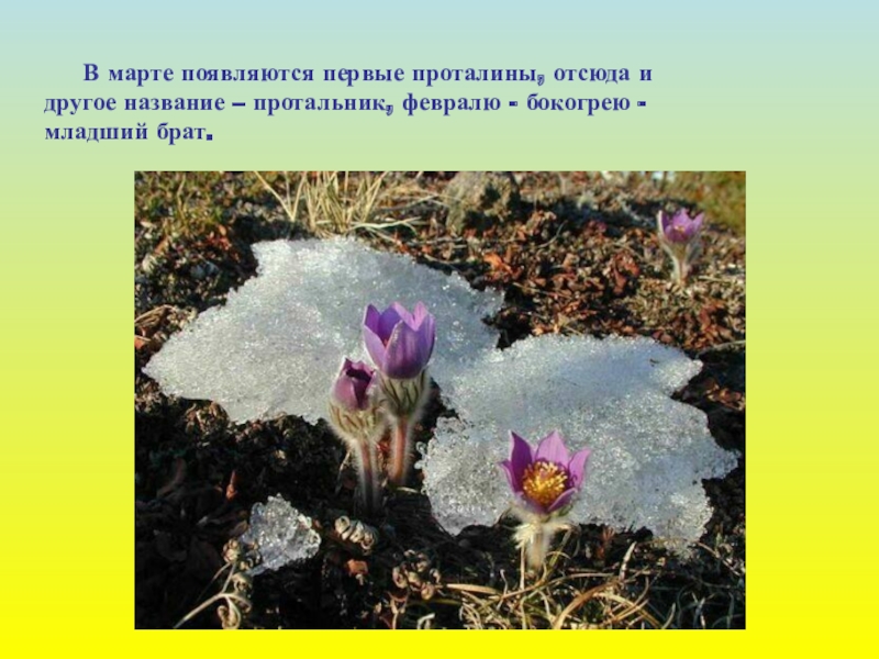 Слайд 8 В марте появляются первые проталины, отсюда и