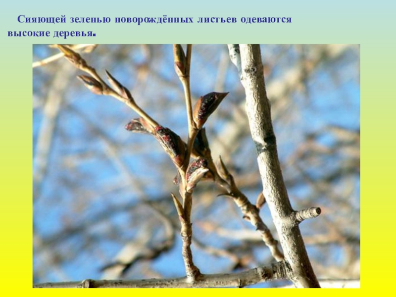 Слайд 43 Сияющей зеленью новорождённых листьев одеваются