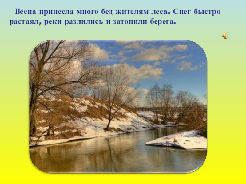 Слайд 22 Весна принесла много бед жителям леса. Снег быстро растаял,