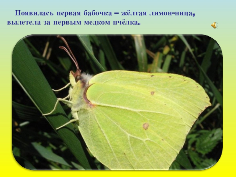 Слайд 38 Появилась первая бабочка – жёлтая лимон-ница, вылетела за